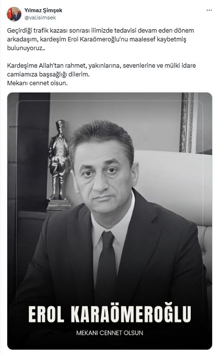 “Geçirdiği trafik kazası sonrası ilimizde tedavisi devam eden dönem arkadaşım, kardeşim Erol Karaömeroğlu'nu maalesef kaybetmiş bulunuyoruz. Kardeşime Allah’tan rahmet, yakınlarına, sevenlerine ve mülki idare camiamıza başsağlığı dilerim. Mekanı cennet olsun.”