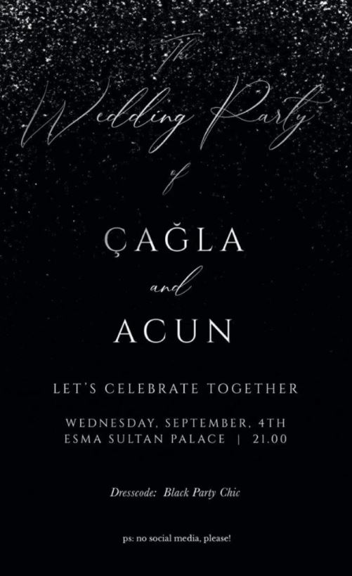 Merakla beklenen düğünün davetiyesi de ortaya çıktı. Acun Ilıcalı, sade, siyah fona yazılı bir dijital nikah davetiyesi hazırlattı ve yakın çevresine gönderdi.