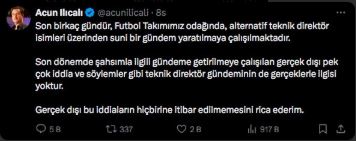 Sosyal medyada yaptığı açıklamada Ilıcalı, son günlerde bilinçli olarak futbol takımının odağı üzerinden farklı isimlerle suni bir gündem oluşturulmaya çalışıldığını belirtti. Ilıcalı, “Son dönemde şahsımla ilgili gündeme getirilmeye çalışılan gerçek dışı pek çok iddia ve söylemler gibi, teknik direktör gündeminin de gerçeklerle ilgisi yoktur. Gerçek dışı bu iddiaların hiçbirine itibar edilmemesini rica ederim” ifadelerini kullandı.