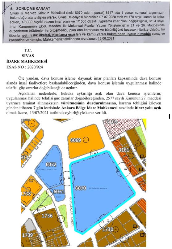 Sivas İdare Mahkemesinin 2020/924 sayılı yürütme kararı bulunan kamu arazisi imara açılarak satılmak istenmektedir. Bu alan 31.08.2021 tarihinde ihaleye çıkarılmıştır.