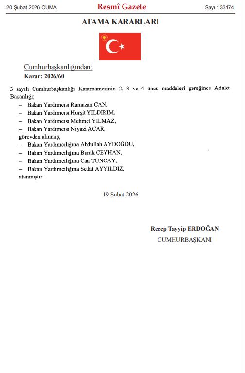 Yayımlanan karara göre Adalet Bakanlığı Bakan Yardımcıları Ramazan Can, Hurşit Yıldırım, Mehmet Yılmaz ve Niyazi Acar görevlerinden alındı. Söz konusu görevlere Abdullah Aydoğdu, Burak Ceyhan, Can Tuncay ve Sedat Ayyıldız atandı.