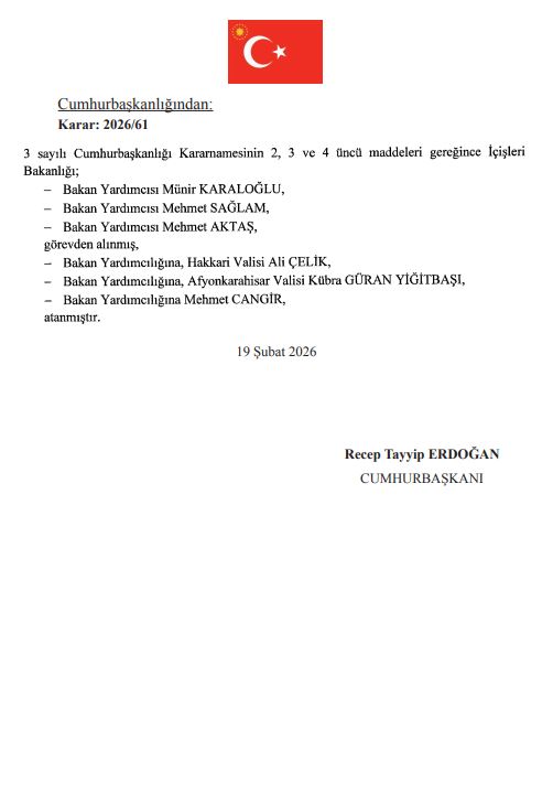 İçişleri Bakanlığında ise Bakan Yardımcıları Münir Karaloğlu, Mehmet Sağlam ve Mehmet Aktaş görevden alınırken, yerlerine Hakkari Valisi Ali Çelik, Afyonkarahisar Valisi Kübra Güran Yiğitbaşı ve Mehmet Cangir getirildi.