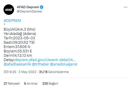 Afet ve Acil Durum Yönetimi Başkanlığından (AFAD) alınan bilgiye göre, saat 09.20'de Adana'nın Aladağ ilçesinde 4.3 büyüklüğünde deprem meydana geldi. Yerin 13 kilometre derinliğinde meydana gelen deprem çevre ilçelerden kuvvetli, il merkezinde ise hafif hissedildiği bildirildi. (İHA-HABER MERKEZİ)