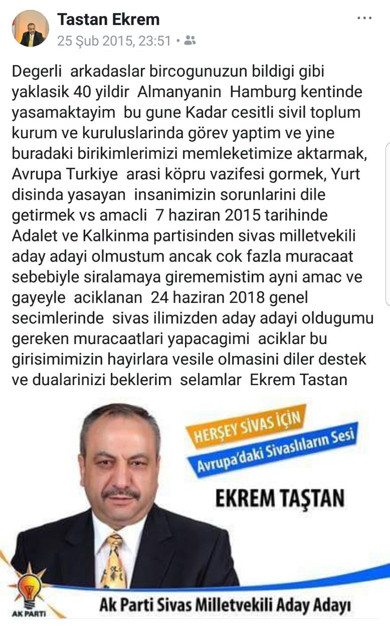 Avrupa Sivaslılar Birliği’nin uzun yıllardır başkanlığını yapan Ekrem Taştan aday adayı oldu. Almanya’nın Hamburg kentinde seyahat acentesi olarak faaliyet gösteren Ekrem Taştan sosyal medya hesabından aşağıda ki paylaşımı gerçekleştirdi.