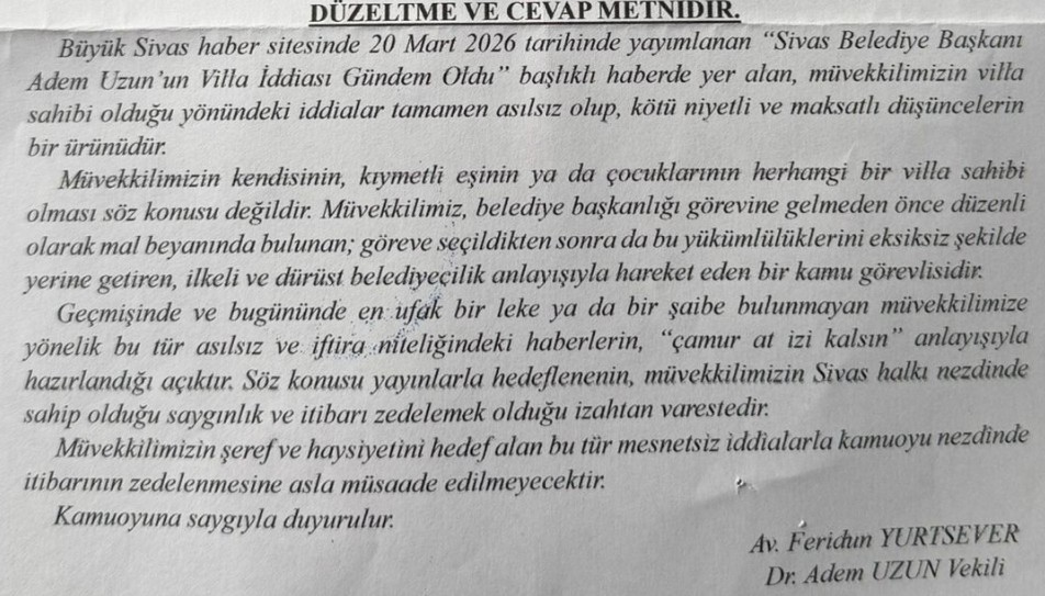 Bugün ise Sivas Belediye Başkanı Adem Uzun’un avukatı tarafından gönderilen cevap metni İl Başkanı Bütün'ün açıklamalarına paralel şekilde oldu.