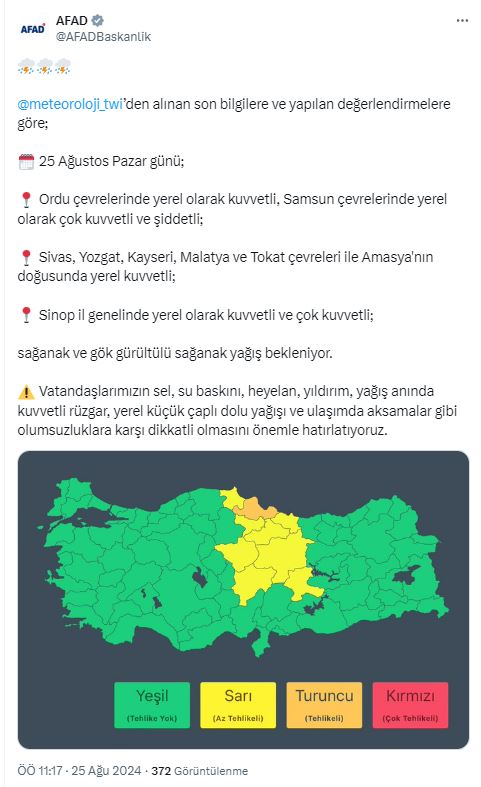 AFAD bir önce sosyal medya hesabı üzerinden uyarıda bulundu.