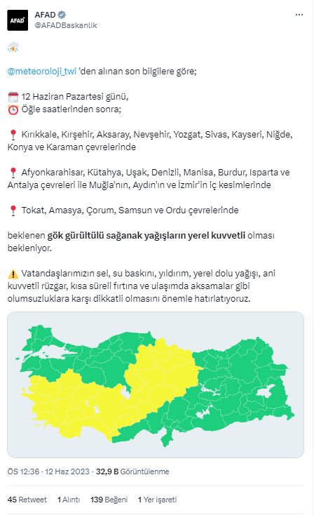 ⚠️ Vatandaşlarımızın sel, su baskını, yıldırım, yerel dolu yağışı, ani kuvvetli rüzgar, kısa süreli fırtına ve ulaşımda aksamalar gibi olumsuzluklara karşı dikkatli olmasını önemle hatırlatıyoruz." ifadelerine yer verildi. (Emre Gençleşen)