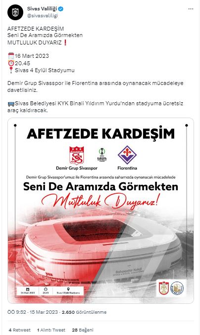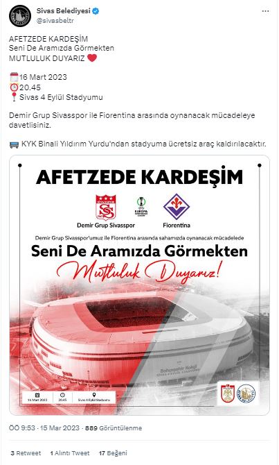Yarın Sivas 4 Eylül Stadyumunda saat 20:45'te oynanacak Uefa Konferans Ligi'nde Demir Grup Sivasspor ile Fiorentina arasındaki maça afetzedeler davet edildi.