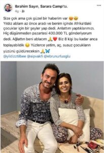 Yıldız ablam az önce aradı ve benim içinde Afrika'daki çocuklar için bir şeyler yap dedi. Anlattım yaptıklarımızı hiç düşünmeden pazartesi 400 bin lira gönderiyorum dedi. Ağlattın beni ablacım biz 8 kişi ancak bu kadar toplayabildik. Yüzlerce yetim aç susuz çocukları sevindireceksin" sözlerine yer verdi.iha