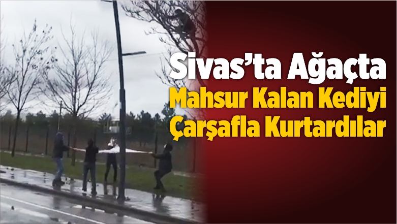Sivas'ta 5 arkadaş ağaçta mahsur kalan kediyi ilginç yöntemle kurtardılar. Ağacın altında çarşaf açan arkadaşlar kediyi kurtararak özgürlüğüne kavuşmasını sağladı.