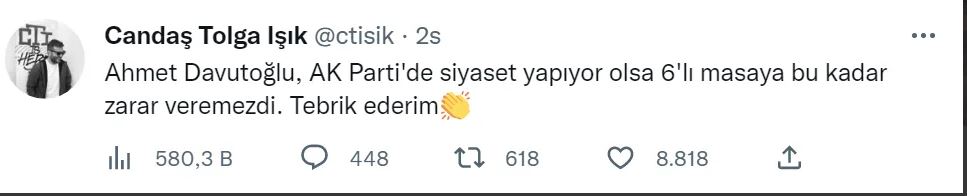 Bunun üzerine gazeteci Candaş Tolga Işık, sosyal medya hesabından "Ahmet Davutoğlu, AK Parti'de siyaset yapıyor olsa 6'lı masaya bu kadar zarar veremezdi. Tebrik ederim" paylaşımı yaptı. -internethaber