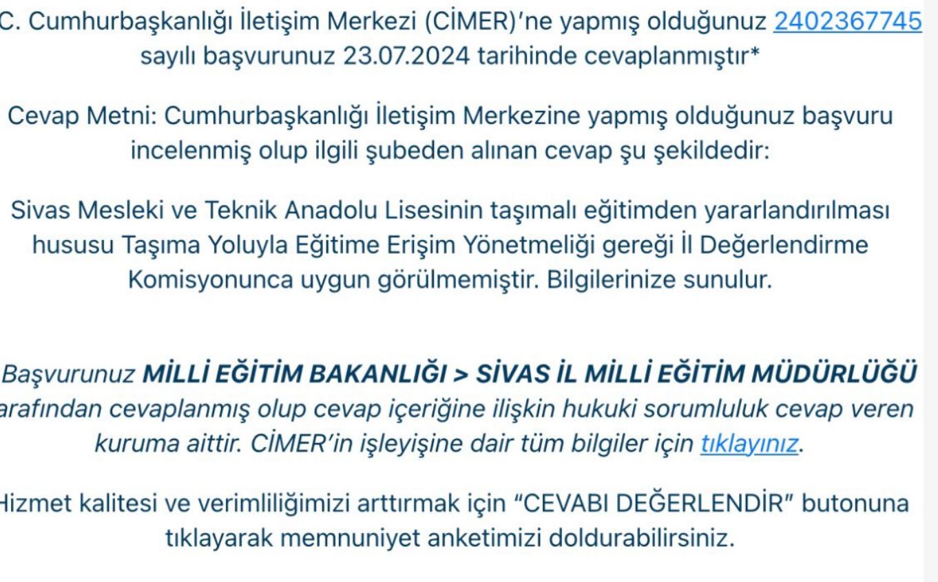 Büyük Sivas WhatsApp hattımız 05558981558'e ulaşan veli taşıma ve yemek iptaline tepki göstererek "Daha önce de OSB bölgesinde olan meslek lisesinin taşımalı eğitim ve yemek verilmeme haberiniz ile alakalı olarak da bir şeyler yazmıştım. Tabiki CİMER'e de konuyu ilettim. Gelen cevapta il değerlendirme kurulunun uygun görmemesi üzerine böyle bir karar alındığı yazmaktadır. Ancak Sivaslı aile ve öğrencileri düşünmeden böyle bir karar alan kurulun Sivas’ta yaşayanlardan oluşmadığını düşünmekteyim. Aksi halde Sivas’ta yaşayan bir birey olarak Sivas şehrini ve Sivaslıları düşünmeden böyle bir karar alacağı mantığıma sığmamaktadır. Gün geçmesin ki haber portalında ilgili kurum müdürü ile alakalı bir haber çıkmasın. Bu kadar şaibeli ve ekmek yediği şehrin öğrencilerini düşünmeyen bir kurum müdürü neden hala görevde durur onu da anlamak mümkün değil! Konuyu valilik ve Sivas'ın bütün siyasileri ile paylaşmamıza rağmen kimsenin bilgisinin olmadığı paylaşılmıştır. Ancak valilik ve siyasilerin haberinin bile olmadığı bir konuda bu değerlendirme kurulu kimlerden oluşuyor? Bu denetleme kurulu aldıkları kararın neye mal olacağını değerlendirebiliyorlar mı acaba, bu konu çözülmez ise çok veli çocuğunu okuldan almak zorunda kalacak bunları değerlendirdiler mi yoksa değerlendirme kurulunu değerlendirmek için de bir kurul mu kurulması lazım" dedi...