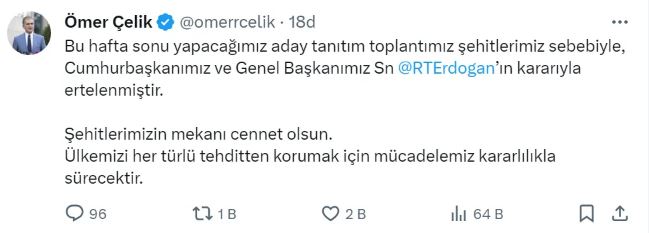 Ömer Çelik, sosyal medya hesabından yaptığı açıklamada, "Bu hafta sonu yapacağımız aday tanıtım toplantımız şehitlerimiz sebebiyle, Cumhurbaşkanımız ve Genel Başkanımız Sayın Recep Tayyip Erdoğan'ın kararıyla ertelenmiştir. Şehitlerimizin mekanı cennet olsun. Ülkemizi her türlü tehditten korumak için mücadelemiz kararlılıkla sürecektir." dedi.