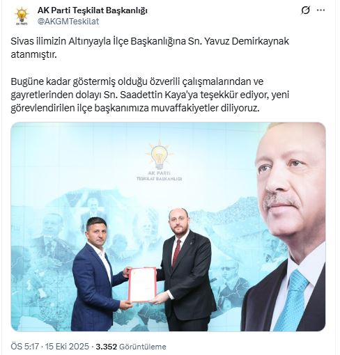 AK Parti Sivas teşkilatında yeni bir atama gerçekleştirildi.