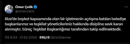 "Rize'de boykot kapsamında olan bir işletmenin açılışına katılan belediye başkanlarımız ve teşkilat yöneticilerimiz hakkında disipline sevk kararı alınmıştır. Süreç, Teşkilat Başkanlığımız tarafından takip edilmektedir." ifadelerini kullandı.