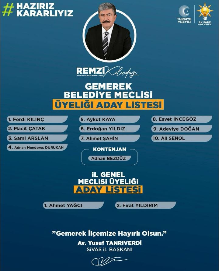 AK Parti Gemerek İl Genel ve Belediye Meclis Üyeleri Listesi belli oldu.