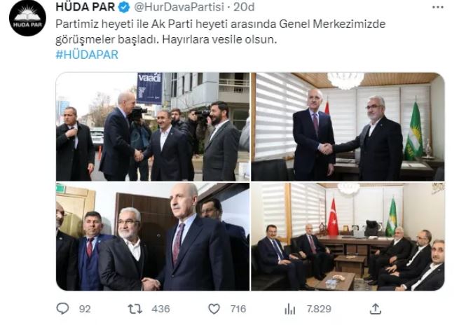AK Parti Genel Başkanvekili Numan Kurtulmuş ve Genel Başkan Yardımcısı Ali İhsan Yavuz HÜDAPAR Genel Merkezini ziyaret etti. Kurtulmuş ve Yavuz, HÜDA PAR Genel Başkanı Zekeriya Yapıcıoğlu ile görüştü. HÜDA PAR, sosyal medya hesabından AK Parti ile görüşmelerine ilişkin fotoğrafları, "Partimiz heyeti ile Ak Parti heyeti arasında Genel Merkezimizde görüşmeler başladı. Hayırlara vesile olsun" notuyla servis etti.