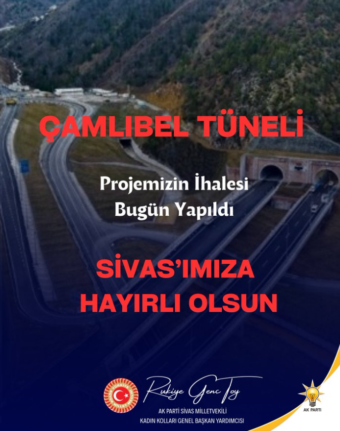 Toy, sosyal medya hesabından yaptığı paylaşımda, Sivas’ımızın ulaşım altyapısına büyük katkı sağlayacak Çamlıbel Tüneli’nin ihale süreci bugün itibariyle tamamlandı. Başta Cumhurbaşkanımız Sayın Recep Tayyip Erdoğan olmak üzere, Ulaştırma ve Altyapı Bakanımız Sayın Abdulkadir Uraloğlu’na ve emeği geçen herkese teşekkürlerimi sunuyorum” ifadelerini kullandı.