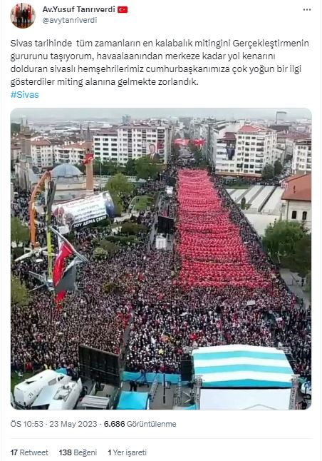 Tanrıverdi yaptığı açıklamada: "Sivas tarihinde tüm zamanların en kalabalık mitingini Gerçekleştirmenin gururunu taşıyorum, hava alanından merkeze kadar yol kenarını dolduran Sivaslı hemşehrilerimiz cumhurbaşkanımıza çok yoğun bir ilgi gösterdiler miting alanına gelmekte zorlandık." ifadelerine yer verdi. (Halil Yavuz Canpolat)