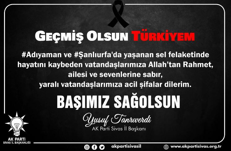 Adıyaman ve Şanlıurfa'da meydana gelen sel felaketi hakkında AK Parti Sivas İl Başkanı Yusuf Tanrıverdi sosyal medya hesabından paylaşımda bulundu.