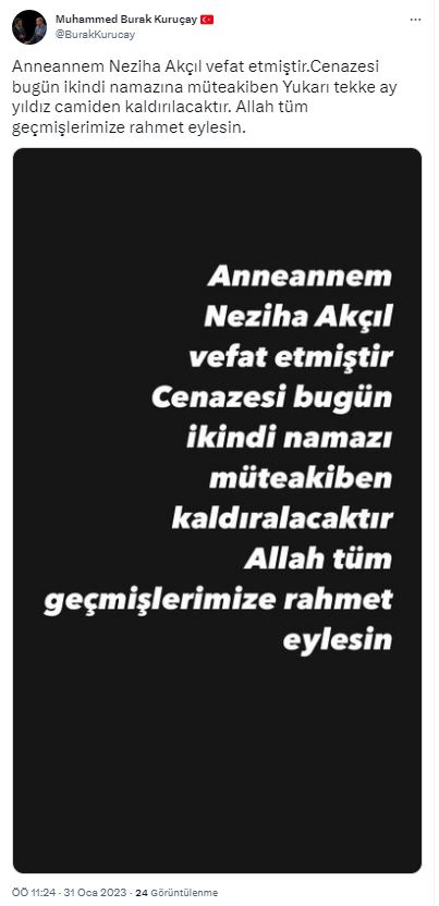 Başkan Kuruçay yaptığı açıklamada: "Anneannem Neziha Akçıl vefat etmiştir. Cenazesi bugün ikindi namazına müteakiben Yukarı tekke ay yıldız camiden kaldırılacaktır. Allah tüm geçmişlerimize rahmet eylesin." ifadelerine yer verdi.