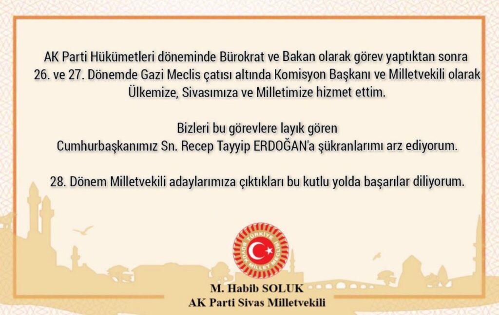 27. Dönem AK Parti Sivas Milletvekili Mehmet Habib Soluk sosyal medya hesabından paylaşım yaptı.