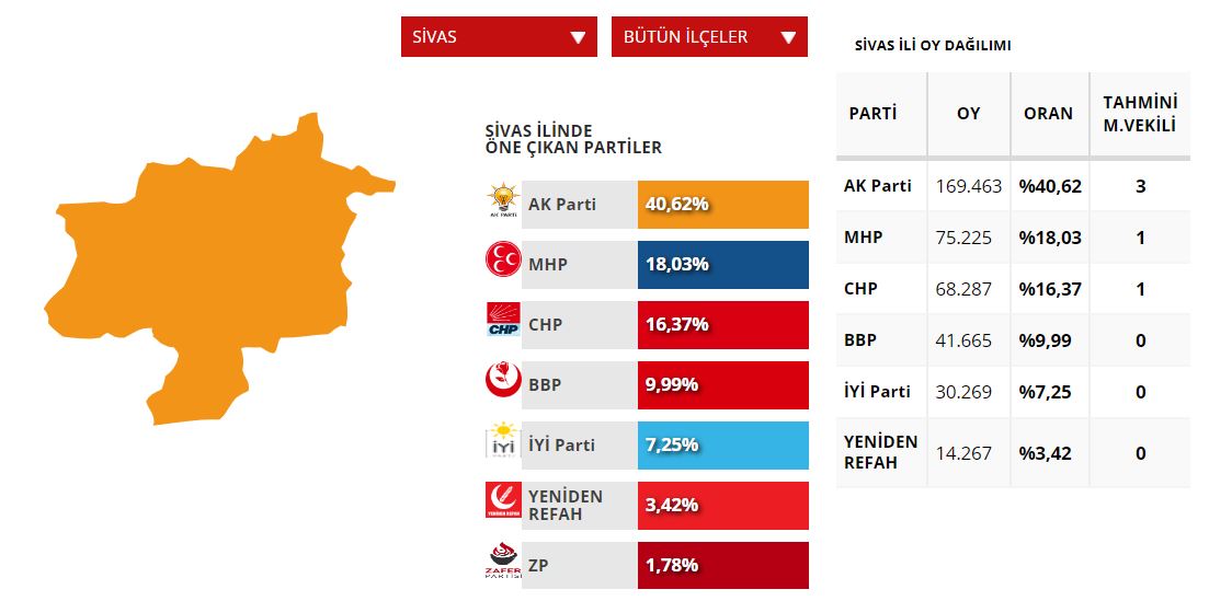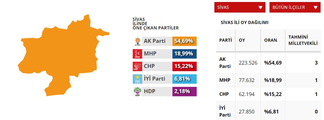 AK Parti ilimiz Sivas'ta 2018 seçimlerinde % 55 oy alırken 14 Mayıs 2023 seçimlerinde ise bu oran % 40'a kadar geriledi. Türkiye genelindeki AK Parti'nin oy kaybı % 7 iken ilimiz Sivas'ta bu oranın % 15 seviyesinde olması partilileri düşündürüyor. (ŞEREF GÜLMEZ)