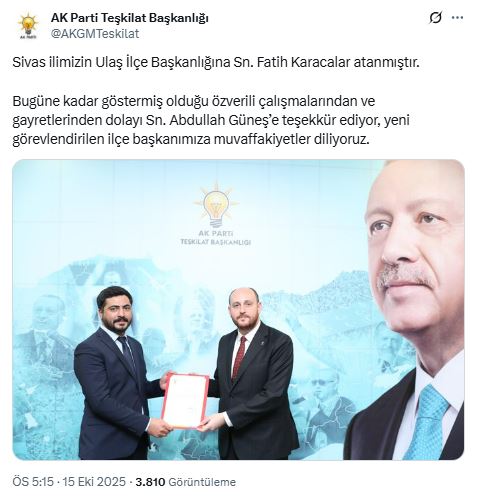 Sivas’ta teşkilat yapılanması kapsamında önemli bir değişiklik gerçekleştirildi. AK Parti Ulaş İlçe Başkanlığı görevine Fatih Karacalar atandı.