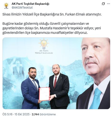 AK Parti Sivas teşkilatında görev değişimi gerçekleşti. Yıldızeli İlçe Başkanlığı görevine Furkan Elmalı atandı.