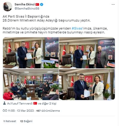 AK Parti Sivas Milletvekili Semiha Ekinci sosyal medya hesabından 28. Dönem Milletvekilliği için aday adaylığına başvurduğunu açıkladı.