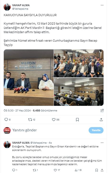 “Kıymetli hemşehrilerim, 13 Mart 2023 tarihinde büyük bir gururla üstlendiğim AK Parti Mardin İl Başkanlığı görevini isteğim üzerine Genel Merkezimizden affımı talep ettim.