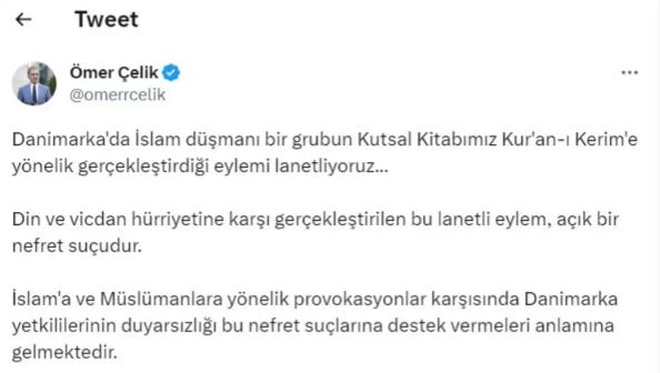 AK Parti Sözcüsü Çelik, sosyal medya hesabından yaptığı paylaşımda, "Danimarka'da İslam düşmanı bir grubun Kutsal Kitabımız Kur'an-ı Kerim'e yönelik gerçekleştirdiği eylemi lanetliyoruz... Din ve vicdan hürriyetine karşı gerçekleştirilen bu lanetli eylem, açık bir nefret suçudur. İslam'a ve Müslümanlara yönelik provokasyonlar karşısında Danimarka yetkililerinin duyarsızlığı bu nefret suçlarına destek vermeleri anlamına gelmektedir." ifadelerine yer verdi. (Emre Gençleşen)