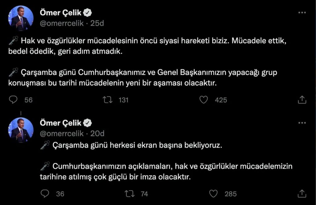 AK Parti Sözcüsü Ömer Çelik sosyal medya hesabından yaptığı paylaşımla CHP Genel Başkanı Kemal Kılıçdaroğlu'na yanıt verdi. Çelik mesajında "Hak ve özgürlükler mücadelesinin öncü siyasi hareketi biziz. Mücadele ettik, bedel ödedik, geri adım atmadık" ifadelerine yer verirken Cumhurbaşkanı Erdoğan'ın çarşamba günü yapacağı grup konuşmasının bu tarihi mücadelenin yeni bir aşaması olacağını duyurdu. İşte AK Parti Sözcüsü Ömer Çelik'in sosyal medya hesabından yaptığı açıklamalar...