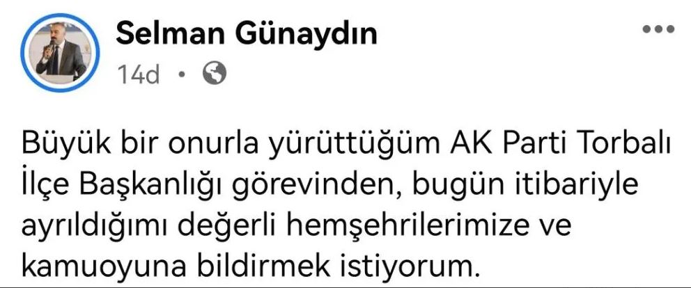 AK Parti Torbalı İlçe Başkanı Selman Günaydın, sosyal medya hesabından yaptığı paylaşımla görevinden istifa ettiğini açıkladı.