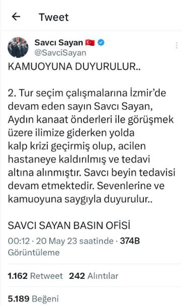 Savcı Sayan'ın resmi Twitter hesabını yöneten Basın Ofisi tarafından yapılan paylaşımda "2. Tur seçim çalışmalarına İzmir’de devam eden sayın Savcı Sayan, Aydın kanaat önderleri ile görüşmek üzere ilimize giderken yolda kalp krizi geçirmiş olup, acilen hastaneye kaldırılmış ve tedavi altına alınmıştır. Savcı beyin tedavisi devam etmektedir. Sevenlerine ve kamuoyuna duyurulur" ifadelerine yer verildi. (İHA)