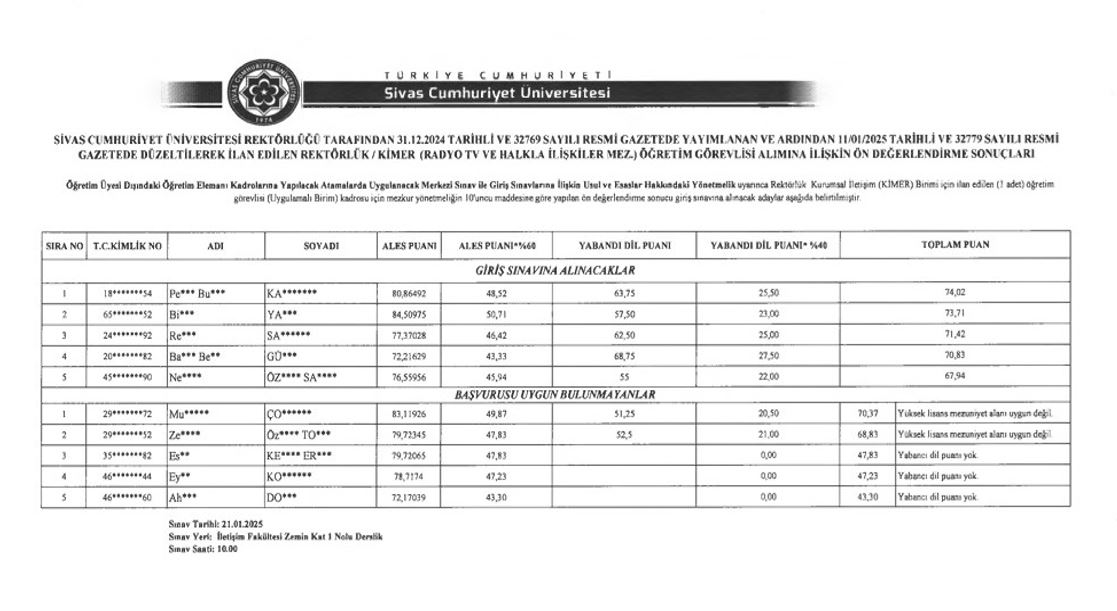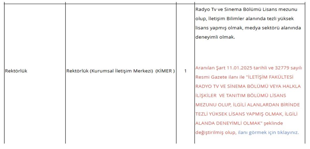 31 Aralık 2024 tarihinde Resmi Gazete’de ve üniversitenin internet sitesinde yayımlanan Sivas Cumhuriyet Üniversitesi Rektörlük (KİMER) öğretim görevlisi alım ilanının, 13 Ocak 2025’te değiştirildiği iddia ediliyor. Değişikliğin belirli kişileri avantajlı hale getirmek için yapıldığı yönünde çeşitli tartışmalar yaşanıyor.