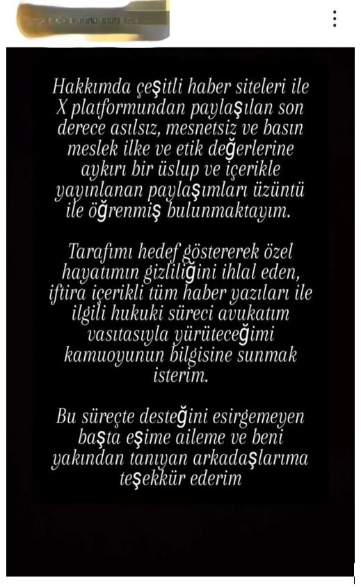 N.Ö.S’nin yaptığı açıklamada, kendisiyle ilgili mesnetsiz ve usulsüz haberler nedeniyle hukuki süreç başlattığını açıkça ifade ettiği belirtildi.