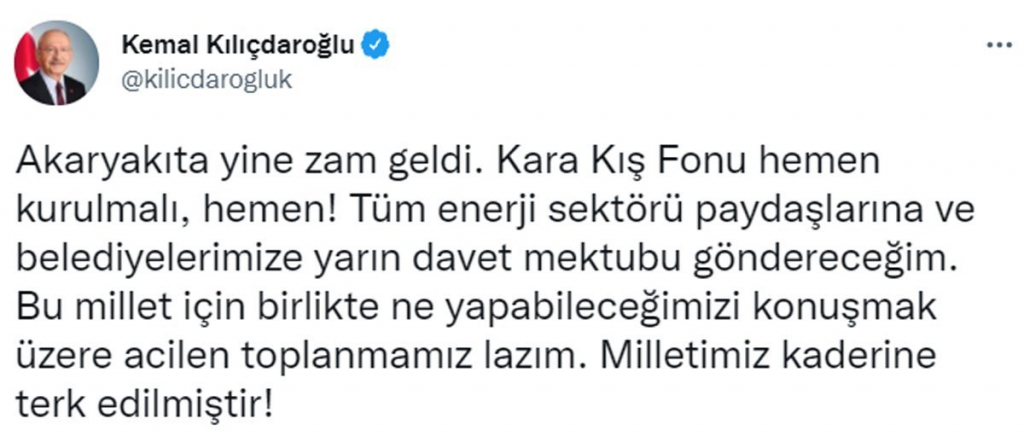 CHP Genel Kemal Kılıçdaroğlu, sosyal medya hesabından açıklamada bulundu. Peş peşe gelen akaryakıt zamlarına dikkat çeken Kılıçdaroğlu, şu ifadeleri kullandı;