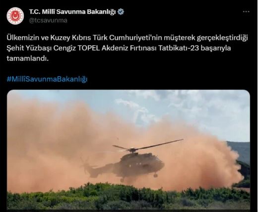"Ülkemizin ve Kuzey Kıbrıs Türk Cumhuriyeti'nin müşterek gerçekleştirdiği Şehit Yüzbaşı Cengiz TOPEL Akdeniz Fırtınası Tatbikatı-23 başarıyla tamamlandı."