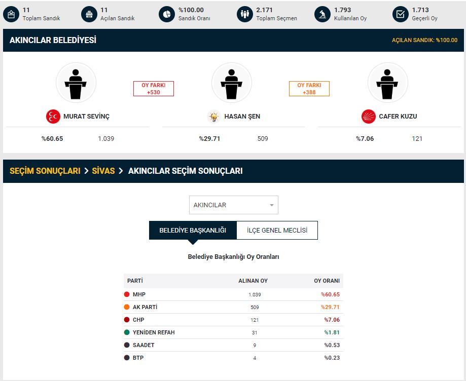 İşte 31 Mart 2024 Yerel Seçimlerinde Akıncılar İlçesinin Başkanlık seçim sonuçları..