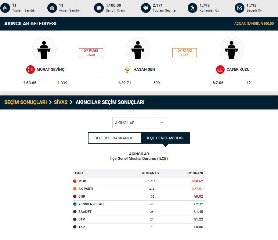 İşte 31 Mart 2024 Yerel Seçimlerinde Akıncılar İlçesinin Başkanlık seçim sonuçları..