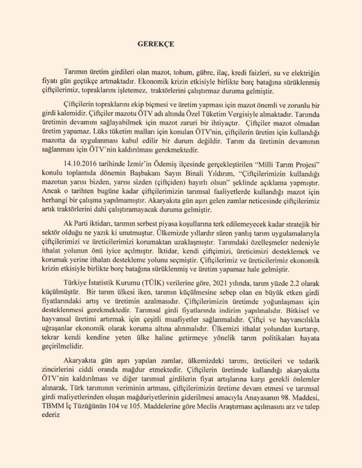 * Çiftçilerin üretimde kullandığı akaryakıtta ÖTV’nin kaldırılması ve tarımsal girdilerin fiyat artışlarına karşı gerekli önlemler alınarak, Türk tarımının veriminin artması, çiftçilerimizin üretime devam etmesi ve girdi maliyetlerinden oluşan mağduriyetlerinin giderilmesi amacıyla Anayasanın 98. Maddesi, TBMM İç Tüzüğünün 104 ve 105. maddelerine göre Meclis Araştırmasını arz ve talep ederiz”