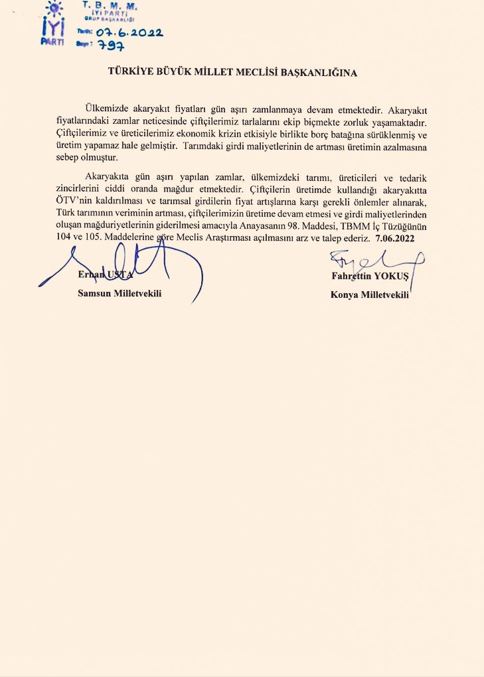 İYİ Parti Grup Başkanvekili Erhan Usta ve Konya Milletvekili Fahrettin Yokuş, çiftçilerin kullandığı akaryakıtta ÖTV'nin kaldırılması, girdi fiyat artışlarına karşı önlemlerin alınması” amacıyla Meclis’e önerge sundu.