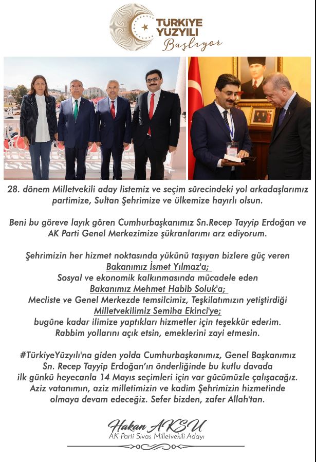 28. Dönem TBMM seçimlerinde AK Parti Sivas Milletvekili adayı olarak 2. sıradan gösterilen e. Sivas İl Başkanı Hakan Aksu sosyal medya hesabından adaylığı ile ilgili açıklama yaparken 27. Dönem Sivas Milletvekillerine ayrı ayrı teşekkür etti.
