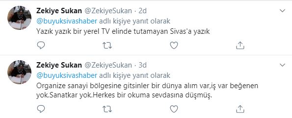 Yayınladığımız haberleri sosyal medya mecrası Twitter'da alıntılayarak "iş var beğenen yok. Sanatkar yok. Herkes bir okuma sevdasına düşmüş." ve "...elinde tutamayan Sivas'a yazık" çıkışlarıyla AK Partili yönetici çok konuşulacağa benziyor.