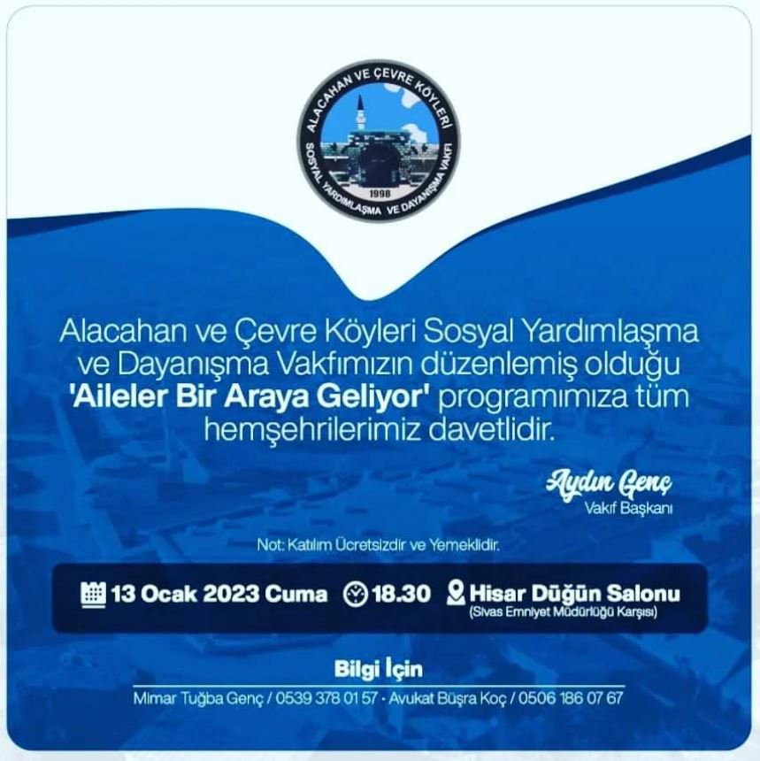 13 Ocak 2023 tarihinde Hisar Düğün Salonunda gerçekleştirilecek olan organizasyonun yemekli olacağını ifade eden Vakıf Başkanı Aydın Genç "Alacahan ve Çevre Köyleri Sosyal Yardımlaşma ve Dayanışma Vakfımızın düzenlemiş olduğu 'Aileler Bir Araya Geliyor' programımıza tüm hemşehrilerimiz davetlidir" dedi.