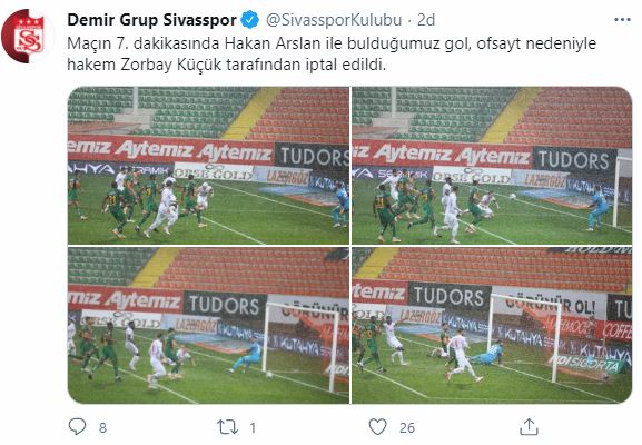 Bu dakikada Demir Grup Sivasspor takımı gole yaklaşıyor ancak ceza sahasının dışından kaleyi sol çaprazdan gören bir noktadan çekilen şut defansın müdahalesiyle engelleniyor.Şutu çeken isim Max Gradel