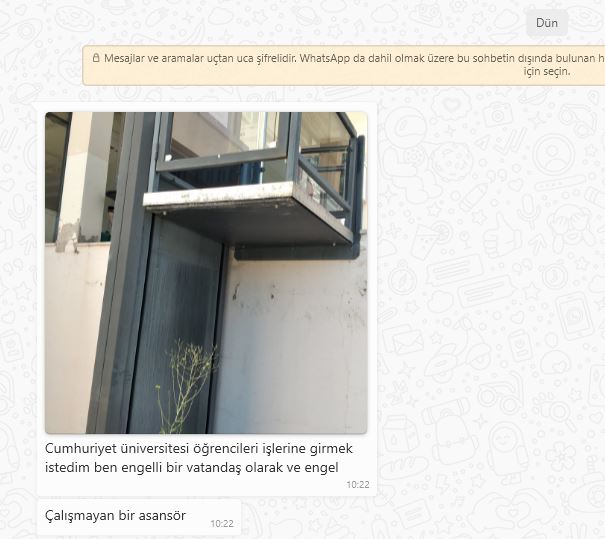 Engelli bir öğrencinin Büyük Sivas WhatsApp haber hattımız 05558981558'e ulaştırdığı bilgilere göre öğrenci işlerinde bulunan engelli asansörü çalışmıyor.