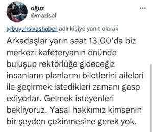 Öğrencilere yaşadılan mağduriyet sonrası eylem hazırlığı yapılıyor. Sosyal medyada öğrenciler "Arkadaşlar yarın saat 13.00'da biz merkezi kafeteryanın önünde buluşup rektörlüğe gideceğiz insanların planlarını biletlerini aileleri ile geçirmek istedikleri zamanı gasp ediyorlar. Gelmek isteyenleri bekliyoruz. Yasal hakkımız kimsenin bir şeyden çekinmesine gerek yok." mesajını paylaşıyor.