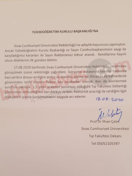 Kamuoyunda geçtiğimiz haftanın en çok tartışılan konusu olan Sivas Cumhuriyet Üniversitesi Tıp Fakültesi Dekanı Prof. Dr. İlhan Çetin'in istifa etmesi / ettirilmesi hususunda yeni gelişmeler yaşanmaya devam ediyor.